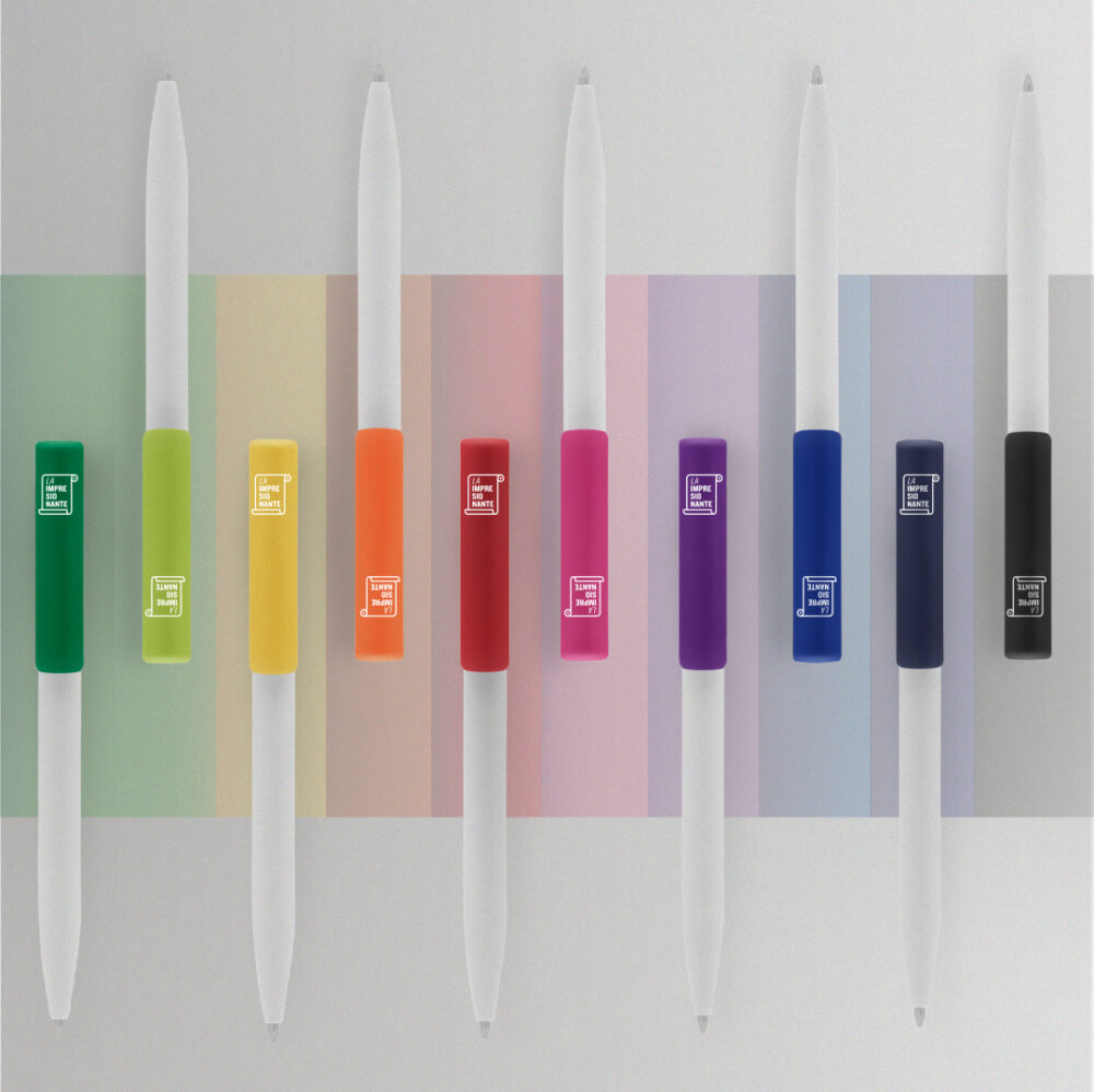 Gama Duo combina un cuerpo blanco limpio con un clip de color vibrante para un toque distintivo. Fabricado en plástico, con tinta negra, sistema de botón push y diseño retráctil.