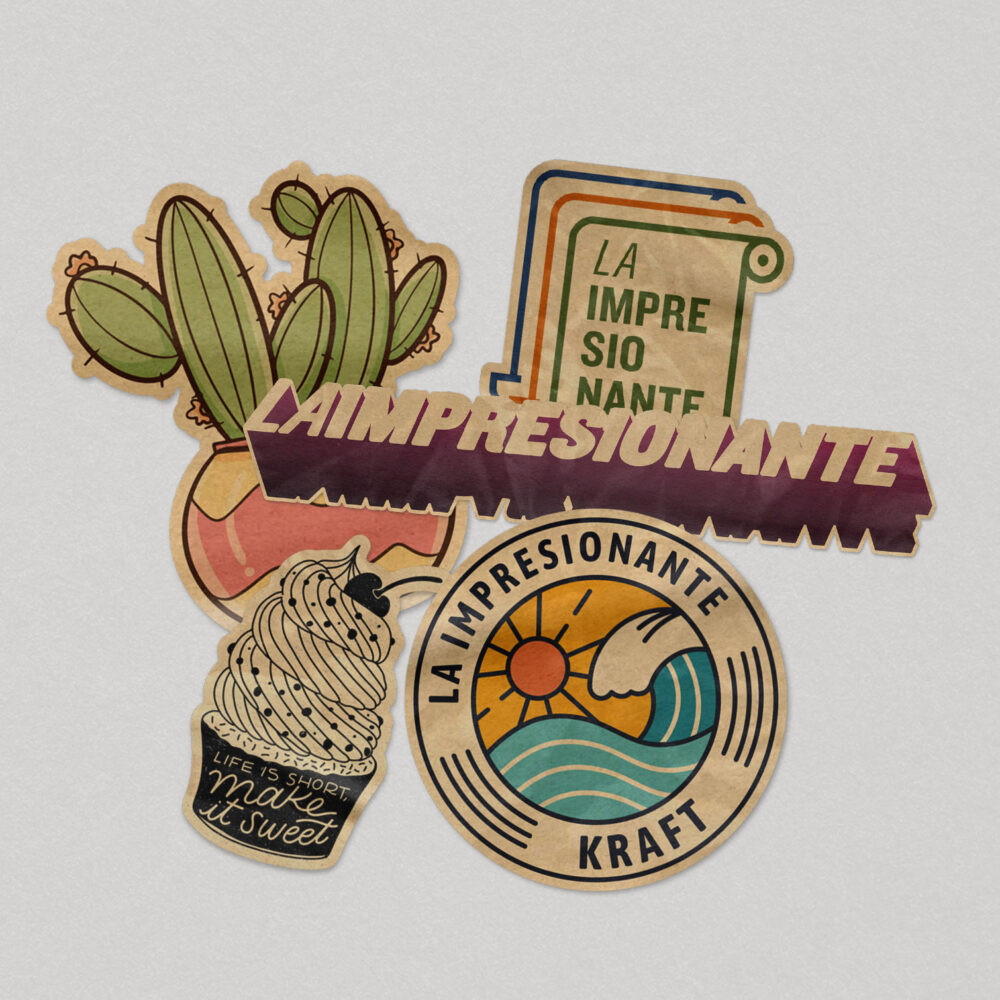 100 Stickers con corte personalizado en Adhesivo Kraft.